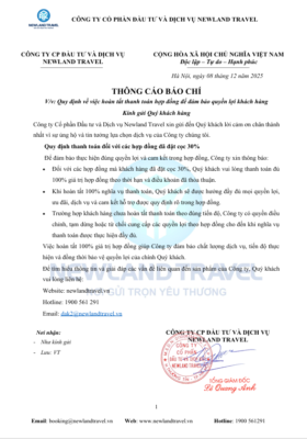 Công ty Cổ phần Đầu tư và Dịch vụ Newland Travel xin gửi đến Quý khách lời cảm ơn chân thành nhất vì sự ủng hộ và tin tưởng lựa chọn dịch vụ của Công ty chúng tôi.